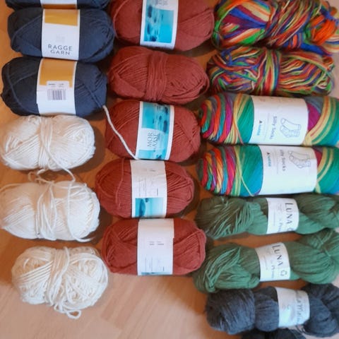 Garnpakke med garn i uld, alpaca, silke og bomuld. Tasken er med bøjle så den kan hænge i et skal på bøjlestang.