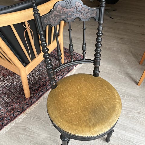 Sæt bestående af to vintage stole beklædt med rosa velourstof. Stolene har en rund sædeform og dekorative frynser langs bunden. Designet inkluderer en buet rygstøtte med lodrette syninger. Stolene har hjul under benene for nem flytning.