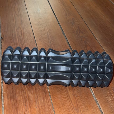 Massage Stick med gule håndtag og hvidt rulleområde. Bruges til muskelmassage og genoptræning.