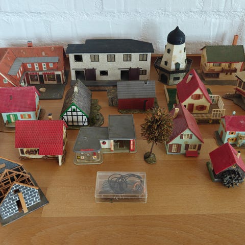 Efter flytning fandt jeg resterne fra min gamle hobby gemt godt væk. Noget er i stykker og noget skal have en klat lim. Tænker godt at lokomotivet kan køre. På en enkelt vogn er to af hjulene løse men ellers fungerer de fint. Det sælges helst samlet.