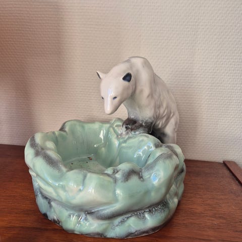 Ditmar Urbach, Tjekkoslovakiet figur skål med motiv af en isbjørn. Skålen er lavet i keramik med grøn og hvid glasur. Skålen har en dekorativ form og er velegnet til brug som pynt eller til opbevaring af småting.