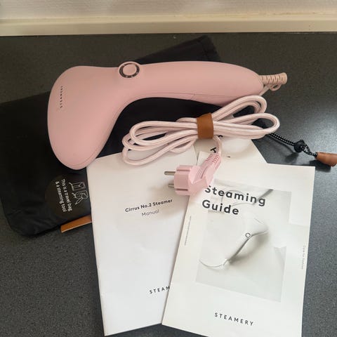 Steamery Cirrus No.2 steamer i lyserød farve. Designet til effektiv fjernelse af folder og rynker i tøj. Kompakt og brugervenlig model.