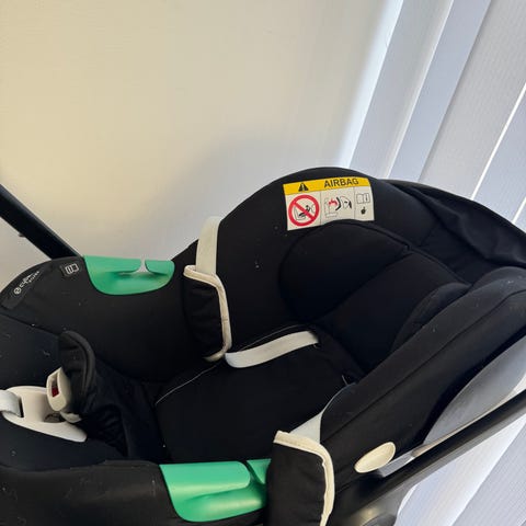 Autostolen har sort polstring. I fin stand men med brugsspor. Der mangler desværre en enkel beskyttelsespude til den ene sele.