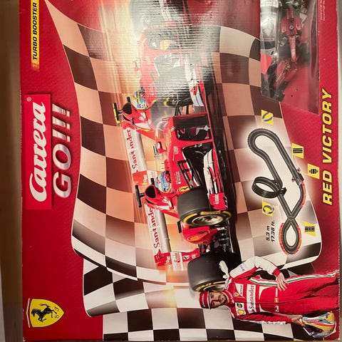 sæt med bilbane, to racerbiler og forskellige banedele. Inkluderer elektriske komponenter til drift af bilerne. Sættet kan samles i flere konfigurationer og er velegnet til børn og samlere.