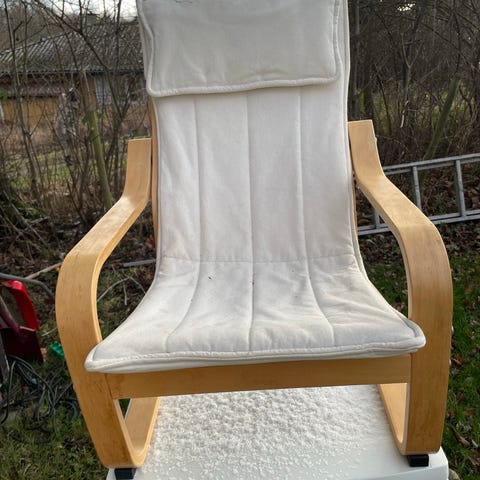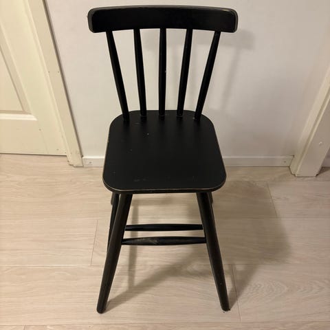 IKEA Børnestol i sort farve. Stolen er designet til børn og har en robust konstruktion med ryglæn og benstøtte. Materialet er træ, og den egner sig til brug i hjemmet som siddeplads for børn.
