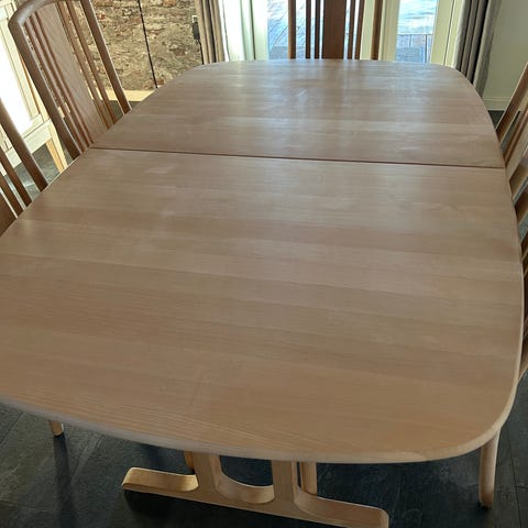 Bordet er ligeledes massiv bøgetræ, måler Ø125 og er 71 cm højt. Bordet er sæbebehandlet. Til bordet er der to tillægsplader á 50 cm, det vil sige maksbredde er 225.