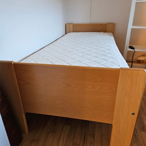 Brug men fin elevationsseng. Den er mellem hårdhed men virker blød. Topmadras følger med som er næsten ny (fra IKEA)