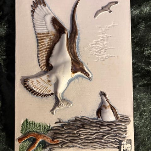 Smukt og velbevaret relief uden skår og afslag. Motivet forestiller to hvide duer på en gran. Farverne er hvid, grøn og brun. Der er ophæng bagpå med ståltråd.