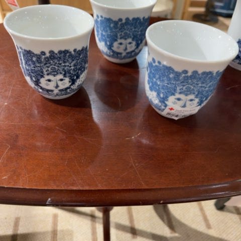 Bjørn Wiinblad termo kopper med farverige print af kvinder i rød, grøn, lilla og blå. Kopperne er lavet af porcelæn. Velegnet til servering af varme og kolde drikke.