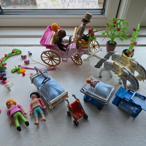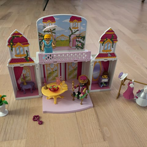 Playmobil legetøjssæt med slot, flere figurer, hestevogn, møbler og tilbehør. Indeholder forskellige elementer til leg og samling.