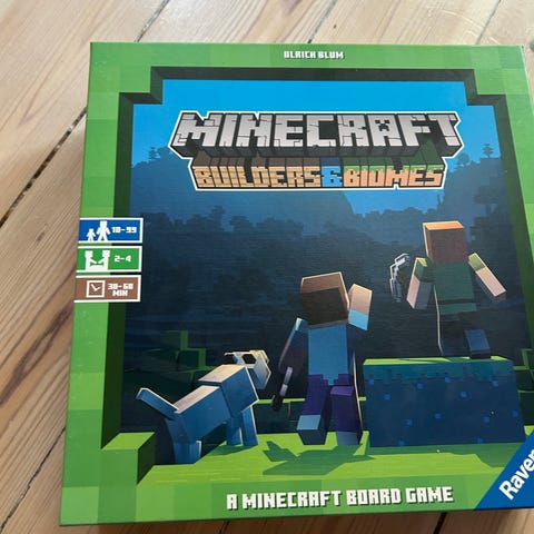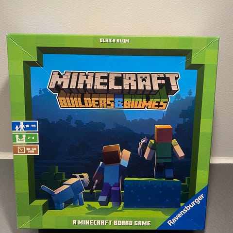 Ravensburger Minecraft Builders & Biomes brætspil. Et brætspil baseret på Minecraft-universet, hvor spillere kan udforske og bygge i forskellige biomer. Spillet indeholder elementer fra Minecraft og er designet til flere spillere.