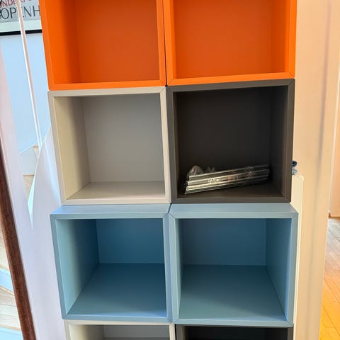 Fire EKET reoler/skabe fra IKEA. To med låge, og to uden. Reolerne sælges samlet, eller hver for sig. Der medfølger skinner til at hænge skabene sikkert op på væggen :)