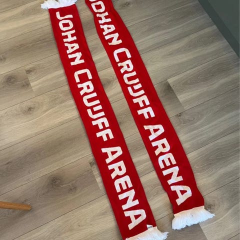 AFC Ajax fodboldhalstørklæde med tekst og logo i rød og hvid farve. Inkluderer navnet Johan Cruijff Arena, Amsterdam. Designet til fans og til brug ved fodboldkampe og supporteraktiviteter.
