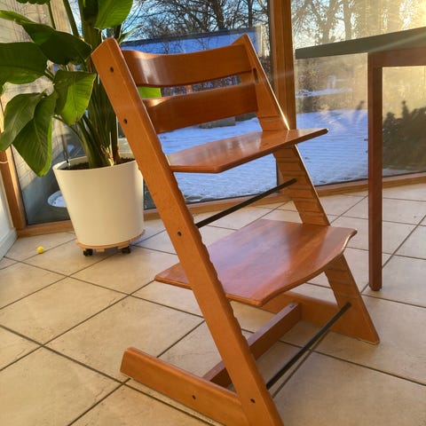 Stokke Tripp Trapp højstol i træ. Højstolen er designet til børn op til 12 år og kan justeres i højde og dybde for at give optimal ergonomisk siddekomfort.