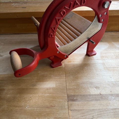 Fiskars Råadvad brødskærer i rød støbejern med træskæreflade. Designet til manuel skæring af brød med robust konstruktion og skarpt blad.