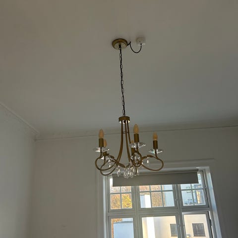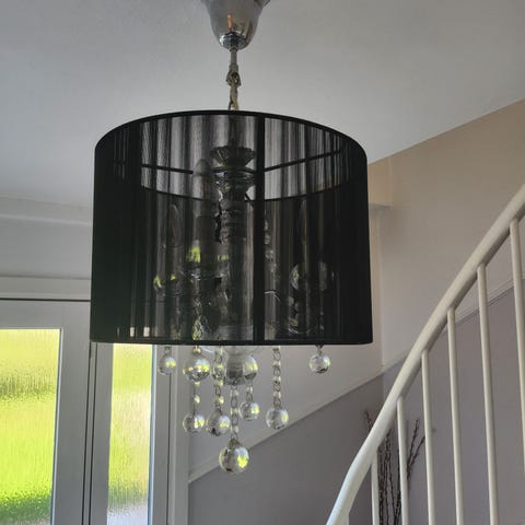 Flot afdæmpet nyfortolkning af krystallysekronen. Smuk fra alle vinkler. Billeder er af en lignende model da min er pakket ned pga flytning. Den jeg sælger har en grå skærm 20x40 cm med dråbemønster. Reservekrystaller medfølger