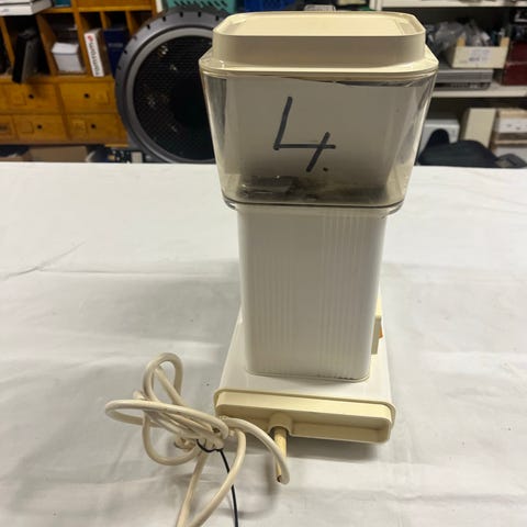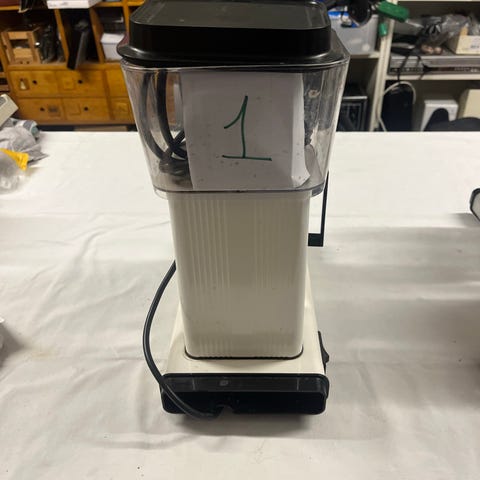 Moccamaster kaffemaskine med glas kande. Kaffemaskinen har en hvid krop og en gennemsigtig vandbeholder med målemarkeringer. Den leveres med en sort filterholder og en glas kande med håndtag til brygning af kaffe.