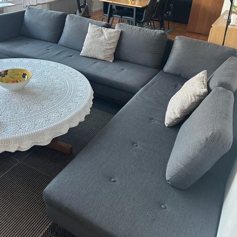 Brugt hjørnesofa i god stand. Sofaen kan nemt slås ud til soveplads og har praktisk opbevaring i chaiselongen – perfekt til dyner, puder m.m.