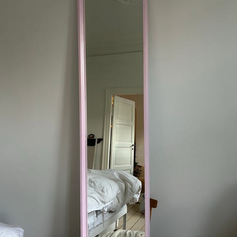 IKEA Nissadal spejl med lyserød ramme. Spejlet har brugsspor og mindre skader på rammen.