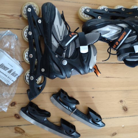 Fine justerbare skøjter og in-liner/rulleskøjter i str. 34-41. Tilpasses din størrelse. Når skinnen skiftes, er det enten skøjter eller rulleskøjter. Sender gerne på købers regning eller kan afhentes.