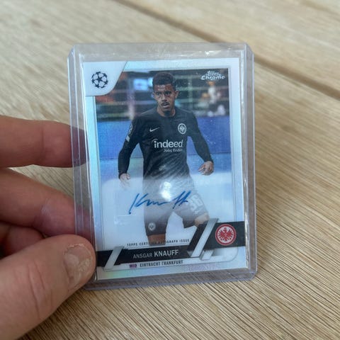 Topps Chrome Bundesliga Jamie Leweling autografkort fra sæsonen 2022/23. Kortet er nummereret 040/165 og har en signatur fra spilleren. Kortet er i beskyttende etui.