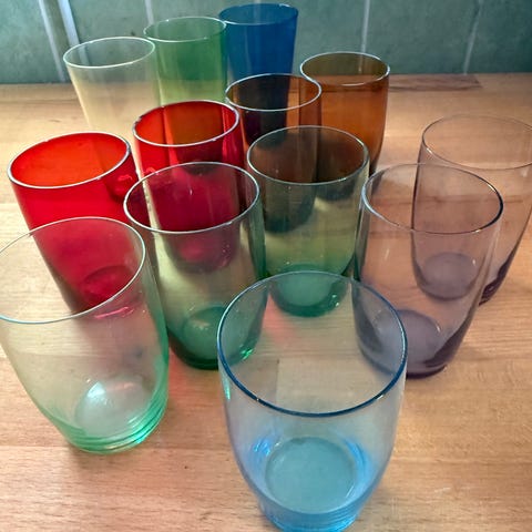 Sæt bestående af 11 farvede glas i forskellige nuancer. Glassets materiale er gennemsigtigt glas, og de varierer i farve fra grøn, blå, klar, gul til orange. Velegnet til servering af drikkevarer.højde 10 cm. Samlet