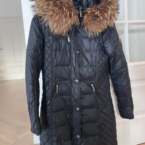 Lækker varm sort quilted Rockandblue Rock and Blue Ciara vinterjakke med pels. Pelsen kan lynes af. Lækre forede lommer og 2-vejs lynlås.