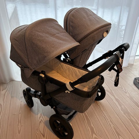 Bugaboo Duo barnevogn til tvillinger eller søskende i beige farve. Super velholdt. Barnevognen har to sæder side om side med justerbare kalecher og sikkerhedsseler. Den har fire hjul og en robust ramme, der sikrer stabilitet og komfort. Velegnet til transport af to børn samtidig. Det er muligt at vende så børnene også kan kigge den anden vej eller hver for sig.
