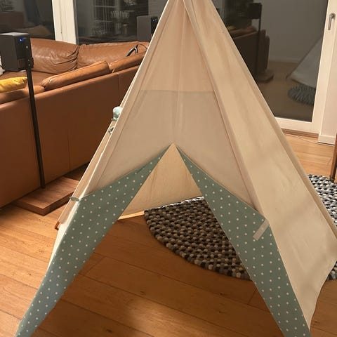 Kids Concept børnetelt med naturfarvet stof og træstænger. Teltet er designet til indendørs brug og kan bruges som legeområde for børn.