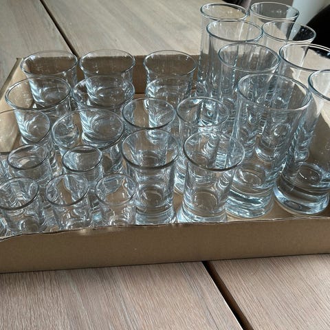 Holmegaard serie nr. 5 glas til drikkevarer i klart glas. Sættet indeholder forskellige typer glas, herunder vinglas, vandglas, ølglas og små snaps- eller likørglas. Glasene er fremstillet i klart glas og egner sig til forskellige drikkevarer. Hel serie. 2 rødvinsglas mindre skåret. Nypris ca. 15.000. Købt over de sidste 10 år. Ikke brugt de sidste 3 år.