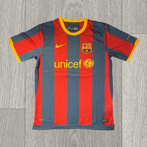 Nike FC Barcelona Messi fodboldtrøje og strømper i lyseblå. Trøjen har nummer 10 og navn på ryggen, samt klublogo og sponsormærker. Sættet inkluderer matchende strømper med Nike-logo og klubdetaljer. Syningen nederst er gået op og det ene lille Nikemærke er løst nederst på trøjen.