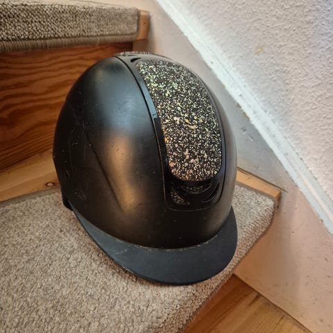 Ride Ridesport ridehjelm i sort farve. Hjelmen har ventilationsåbninger og justerbar rem for sikker pasform. Mærke Horka