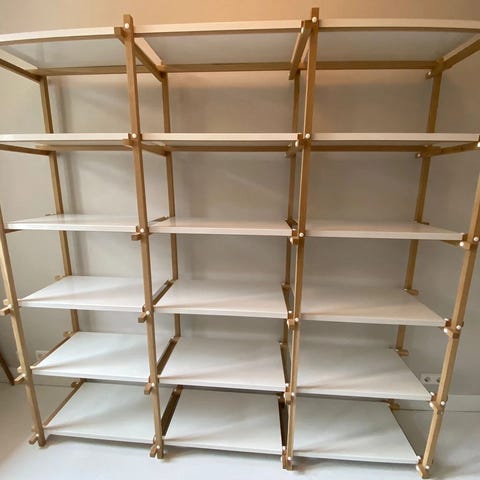 Fin reol i god stand. Nogle af hylderne har tegn efter brug. Reolen er skilt ad.