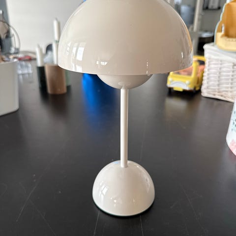 &Tradition Verner Panton bordlampe i hvid farve. Lampen har en rund skærm og fod med en slank stang imellem. Designet af Verner Panton, velegnet til brug som bordlampe i hjemmet eller på kontoret.