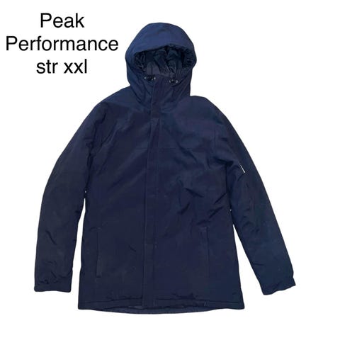 Peak Performance Vinterjakke i størrelse XXL, fremstillet af Gore-Tex materiale. Jakken er blå og designet til udendørs brug i vinterforhold.