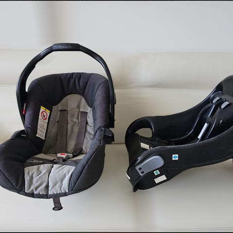 Graco autostol til baby. Autostolen har polstret indlæg og sikkerhedsseler til fastspænding af barnet. Base medfølger. Autostolen kan klikkes af.
