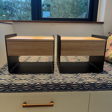 Væghængt Pinella sengebord i eg melamin og sortlakeret metal. 1 skuffe og åben hylde nedenunder.