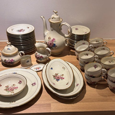 Porcelæn kaffestel. Serveringsfade. Tandstikholder. Stellet er dekoreret med sort og hvidt blomstermotiv og har sølvfarvede kanter.