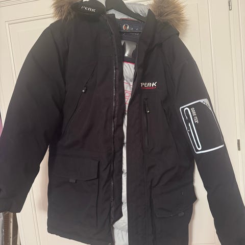 Peak Performance Vinterjakke i sort farve, størrelse XXL til herrer. Jakken er lavet af dun, hvilket giver isolering og varme til udendørs brug i kolde forhold.
