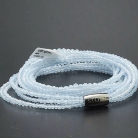 Perlearmbånd med runde perler i rosa og en enkelt hvid perle. Armbåndet er elastisk og passer til håndled af forskellige størrelser. Perlerne har en diameter på cirka 8 mm.