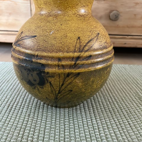 Imponerende bøhmisk Art Deco trompetvase i røgfarvet glas, fremstillet omkring 1930 ved Stölzle Hermanova Hut – en af de mest markante glasfabrikker i det daværende Bøhmen, nu Tjekkiet. Vasen er udført i et karakteristisk snoet design, hvor glasmassen er drejet i vertikale bevægelser, hvilket skaber et dynamisk spil mellem lys og skygge. Den brede åbning og den markante firkantede fod giver vasen en skulpturel fremtoning, der balancerer mellem funktion og dekorativ elegance. Foden måler 11,5 x 11,5 cm, højden er 26 cm, og randen har en diameter på 23 cm. Designet er typisk for Art Deco-perioden, hvor geometriske former, symmetri og materiale fascination blev omsat til hverdagsobjekter med kunstnerisk ambition. Den røgfarvede tone – opnået ved tilsætning af metalliske oxider – var populær i 1920’erne og 30’erne og signalerede modernitet og raffinement. Stölzle Hermanova Hut blev grundlagt i 1907 og udviklede sig hurtigt til en af de førende producenter af dekorativt glas i Centraleuropa. Fabrikken var især kendt for sine Art Deco-vaser, skåle og karafler, som blev eksporteret bredt og solgt under navnet Stölzle. Efter Anden Verdenskrig blev fabrikken nationaliseret og indlemmet i Sklo Union i 1965 – en sammenslutning af tjekkiske glasværker, der videreførte traditionen for formstærkt og industrielt glasdesign. Denne vase fremstår som et velbevaret og dekorativt eksempel på Stölzles produktion i mellemkrigstiden. Den kombinerer teknisk dygtighed med æstetisk stringens og er velegnet både som solitær objekt og som del af en samling af europæisk Art Deco-glas.