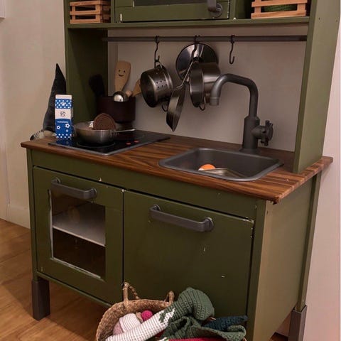 Legekøkke fra IKEA i pæn stand. Der medfølger en kasse med gryder og pander samt diverse legemad bl.a. flere madvare i serien duktig. Derudover tallerkener, kopper og skeer fra Dantoy og et testel i metal med blomster.