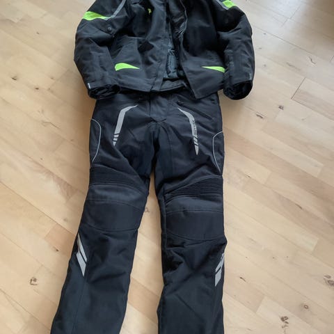 MC dragt fra Rev’it st 38. Brugt af slank kvinde på 167 cm. Næsten ubrugt, har hængt i skab.