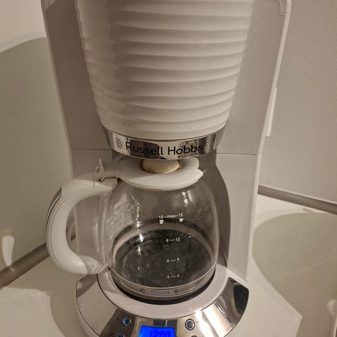 Prisvindende Russell Hobbs kaffemaskine med timerfunktion og glaskande. Kaffemaskinen har en digital display og knapper til indstilling af time og minutter.