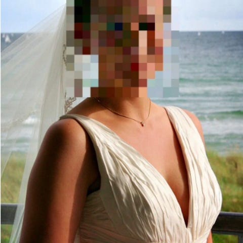 Havfrue facon, asymmetrisk draperet, tyk silke. Med knapper bagpå (26 stk flotte silkebetrukne knapper)
