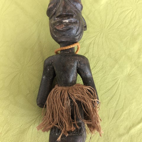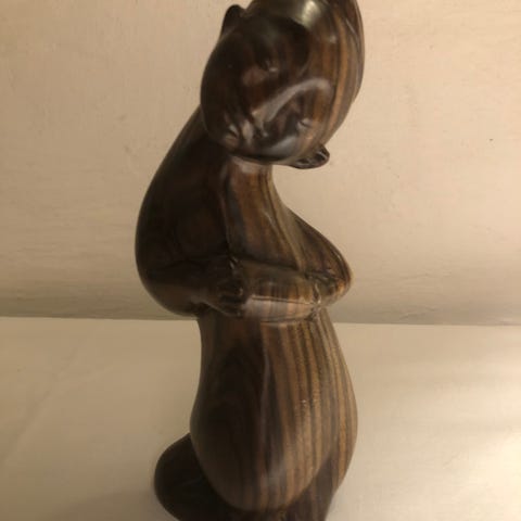 Håndskåret træfigur med grøn og brun farve, ca. 30 cm høj. Figuren forestiller en person med hat og har en rustik, håndlavet finish.
