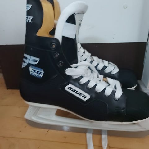 Bauer S23 ishockeyskøjter i størrelse 43. Skøjterne er designet til ishockey og har funktioner tilpasset sporten. Farve og materiale er sort med gule detaljer.