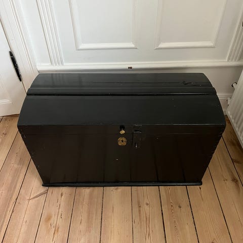 Den fine kiste er står i en flot blålig kulør. Kisten er pæn stand og står med rette patina. God til opbevaring på børneværelset ellee lignende. Måler H: 45cm B: 70cm D: 42cm