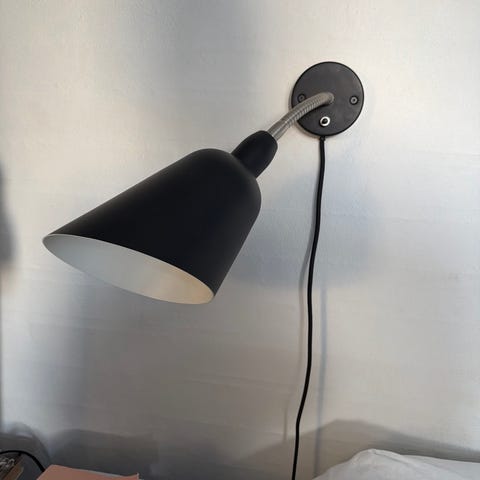 &Tradition Arne Jacobsen Bellevue væglampe med sort lampeskærm og hvid base. Designet af Arne Jacobsen, egnet til brug som væglampe i forskellige rum.