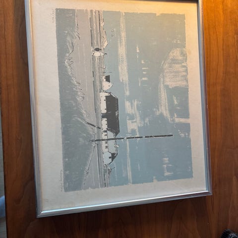 værket er et farvetryk eller maleri, der forestiller et landskab med et bindingsværkshus ved en flod eller et vandløb med et vandfald eller overløb. Huset har et rødt tag og fremstår rustikt, omgivet af tæt grønt løv. Vandet er gengivet med stærke blå nuancer og refleksioner.